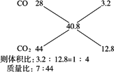 解答:本题有多种解法. 解法一:设原混合气体中CO、CO2的体积分别是V(CO)、V(CO2),则: 解出V(CO)=22.4 L,V(CO2)=8.96 L. 体积比: 质量比:(0.1×28)∶(0.4×44)=7∶44. 解法二:设混合气体中CO和CO2的物质的量分别是n(CO)、n(CO2). 解出n(CO)=0.1 mol;n(CO2)=0.4 mol. 体积比即物质的量之比:1∶4. 质量比:(0.1×28)∶(0.4×44)=7∶44. 解法三:设混合气体中CO和CO2的质量分别是m(CO)、m(CO2). 解出m(CO)=2.8 g,m(CO2)=17.6 g, 质量比:2.8∶17.6=7∶44, 体积比:0.1∶0.4=1∶4. 解法四:设混合气体平均相对分子质量为M,体积分数CO为x%,CO2为(1-x%). ①求出混合物的平均相对分子质量: 所以 ②求体积分数:x%×28+(1-x%)×44=40.8, x%=20%,CO2为80%, 体积比为1∶4. ③求质量比:(28×1)∶(4×44)=7∶44. 解法五:求出混合气体的平均相对分子质量为40.8.利用十字交叉法直接求解.