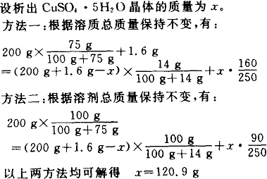 在饱和CuSO4溶液中加入无水硫酸铜,由于形成CuSO4·5H2O晶体,使溶液中水量减少,而水量减少又会引起析出晶体……若再降温,又会进一步析出CuSO4·5H2O晶体.尽管这种问题比较复杂,但仍可根据变化前后溶质总质量或溶剂总质量保持不变的关系求解. |