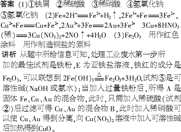 Fe3+、Cu2+、Au3+等离子.有人设计了如图所示的工艺流程,利用常用的酸、碱和工业生产中的废铁屑,从废水中回收金,并生产一定量的铁红和氧化铜.(1)图中标号处需要加入的相应物质分别是①________、②________、③________、④________、⑤________.