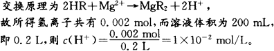 氢离子交换剂HR,交换时发生的反应为HR+M+→MR+H+.现用它处理100 mL含0.001 mol Mg2+的中性溶液,使Mg2+完全被树脂交换,再用蒸馏水洗涤树脂,并将交换液和洗涤液收集在一起,共得200 mL溶液,则该混合液中H+浓度为 | |