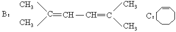 A分子是8个碳原子的烯烃,氧化得到2mol酮D,因此双键应居中,分子的两半是等同的,酮只能是 B分子是8个碳原子的二烯烃,只有这样,才会有两处双键断裂,得到4个被氧化的基团,三个化合物.将它们逆向连接,考虑到含有2mol酮,酮E只能丙酮 C分子的分子式是 |