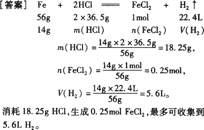 14 g Fe与足量稀盐酸混合充分反应,消耗多少克HCl?生成FeCl2的物质的量为多少?标准状况下最多可以收集到多少升气体?