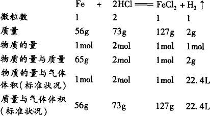解析:学习物质的量之后,化学方程式表示的意义更为广泛,以铁和稀盐酸反应为例,加以说明. 因此,根据化学方程式的计算题,不要拘泥于质量之间的正比关系去列式求解.只要我们注意化学计量数,并使上下(同一物质)单位相同,左右(两种物质)两个量相适应,就可列比例式直接求解.若把已知量转化为物质的量,计算过程更为简便. |