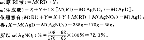 此题为无数据计算题,此类题的一般解题思路为: (1)有固体物质参加反应的化学题,一般运用质量守恒定律来揭示化学反应中物质的量的变化关系. (2)有气体物质参加反应的化学题,一般运用阿伏加德罗定律及其推论,根据化学方程式揭示化学反应中物质的量以及体积数、压强之间的关系. 该题中反应前后溶液质量不变,是因为溶液中的水是守恒的,即碘化物溶液中的水,加硝酸银溶液中的水.若能求出硝酸银溶液中的水量,则其百分比浓度就不难求了. 设某金属碘化物化学式为RI,取其1摩加水Yg;另取1摩硝酸银加水Xg. |