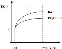 (3)体积为10mLpH=2的醋酸溶液与一元酸HX分别加水稀释至1000mL,稀释过程pH变化如图.则HX的电离平衡常数 (填“大于”、“等于”或“小于”)醋酸的平衡常数;理由是 ,稀释后,HX溶液中水电离出来的c(H+) 醋酸溶液水电离出来c(H+)(填“大于”、“等于”或“小于”)理由是: ;