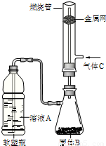 (2)如图所示,将硬质玻璃管改装为燃烧管.挤压软塑瓶壁,向装有固体B的锥形瓶中加入溶液A,同时往燃烧管中通入气体C并点燃,可看到明显的燃烧现象(金属网用以防止气体混合爆炸).