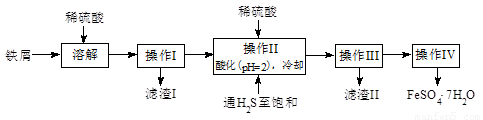 绿矾(FeSO4·7H2O)是治疗缺铁性贫血药品的重要成分。下面是以市售铁屑(含少量锡、氧化铁等杂质)为原料生产纯净绿矾的一种方法: