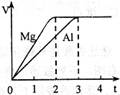 镁和铝分别与等浓度、等体积的过量稀硫酸反应,产生气体的体积(V)与时间(t)关系如下图。反应中镁和铝的( )