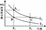 △H > 0 ,在温度分别为T1、T2时,平衡体系中NO2的体积分数随压强变化曲线如右图所示,下列说法正确的是