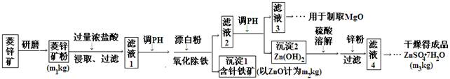 (14分)硫酸锌可作为食品锌强化剂的原料。工业上常用菱锌矿生产硫酸锌,菱锌矿的主要成分是ZnCO3,并含少量的Fe2O3 、FeCO3 MgO、CaO等,生产工艺流程示意如下:
