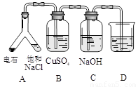 实验目的:探究电石气中的成分 ① 装置A中的化学反应方程式为: _________________________________________。 ②B装置中出现黑色沉淀,可判断电石气中含有________;C装置的作用为__________________。 ③为验证电石气的主要成分,D中盛放________。 |