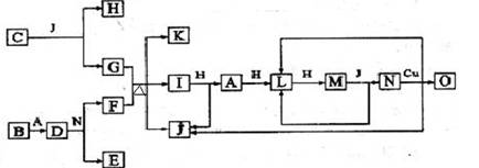 (9分)已知A~O分别代表一种物质,它们之间的转化关系如下图所示(反应条件略去)。A、B、H分别是由短周期元素组成的单质。B与冷水缓慢反应,与沸水迅速反应放出氢气。D是一种离子化合物,其阴阳离子的个数之比为2:3,且能与足量的水反应得到两种碱。C为淡黄色固体化合物,物质O能与G的水溶液反应生成蓝色沉淀。
