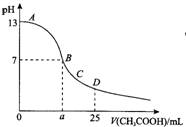 在25mL 0.1mol/L NaOH溶液中逐滴加入0.2mol/L CH3COOH溶液,曲线如图所示,下列有关离子浓度关系的比较,正确的是 ( )