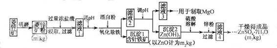 硫酸锌可作为食品锌强化剂的原料。工业上常用菱锌矿生产硫酸锌,菱锌矿的主要成分是ZnCO3,并含少量的Fe2O3 、FeCO3 MgO、CaO等,生产工艺流程示意如下: