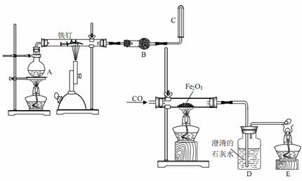 某校兴趣小组的同学进行铁与水蒸气的实验。甲同学直接采用铁钉与水蒸气利用下述左图装置进行实验,最后试图收集气体于试管C中。乙同学先用右图装置进行CO还原Fe2O3,至硬质管中固体由红色转变成黑色,用磁铁进行试验,发现能被吸引,D中出现浑浊;乙同学随即熄灭酒精灯,继续通过CO冷却至室温,然后用所得固体进行甲的实验。