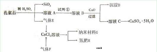 (14 分)孔雀石主要含Cu2(OH)2CO3,还含少量Fe、Si的化合物。以孔雀石为原料可制备CuSO4·5H2O及纳米材料G,步骤如下:![]()