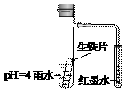 下图装置中,小试管内为红墨水,具支试管内盛有pH=4的雨水和生铁片。观察:开始导管内液面下降,一段时间后导管内液面回升,略高于小试管液面。以下有关解释合理的是