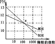 MOH和ROH两种一元碱的溶液分别加水稀释时,pH变化如下图所示.下列叙述中正确的是