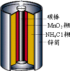 最早使用的化学电源是锌锰电池,即大家所熟悉的干电池(dry cell),其结构如下图所示:尽管这种电池的历史悠久,但对它的电化学过程尚未完全了解.一般认为,放电时,电池中的反应如下: