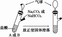 有A、B两个完全相同的装置,某学生分别在它们的侧管中装入1.06 g Na2CO3和0.84 g NaHCO3,A、B中分别有10 mL相同浓度的盐酸,将两个侧管中的物质同时倒入各自的试管中,下列叙述正确的是
