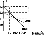 MOH和ROH两种一元碱的溶液分别加水稀释时,pH变化如下图所示.下列叙述中正确的是