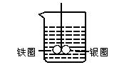 如图所示的装置,在盛有水的烧杯中,铁圈和银圈的连接处吊着一根绝缘的细丝,使之平衡。小心地从烧杯中央滴入CuSO4溶液。片刻后可观察到的现象是(指悬吊的金属圈)( )