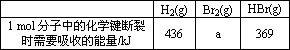 已知H2(g)+Br2(1)=2HBr(g);ΔH=-72 kJ/mol蒸发1 mol Br2(l)需要吸收的能量为30 kJ,其它相关数据如下表: