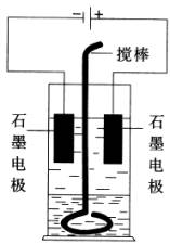 在玻璃圆筒中盛有两种无色的互不相溶的中性液体.上层液体中插入两根石墨电极,圆筒内还放有一根下端弯成环状的玻璃搅棒,可以上下搅动液体,装置如右图.接通电源,阳极周围的液体呈现棕色,且颜色由浅变深,阴极上有气泡生成.停止通电,取出电极,用搅棒上下剧烈搅动.静置后液体又分成两层,下层液体呈紫红色,上层液体几乎无色.根据上述实验回答:
