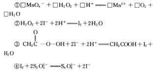 另取bomL待测液,加入过量的KI,并用硫酸使溶液酸化,此时过氧乙酸和残留的H2O2都能跟KI反应生在I2(反应②和③).再用浓度为a2 mol·L-1的Na2S2O3标准溶液滴定生成的I2,耗用Na2S2O3溶液体积为b2 mL.