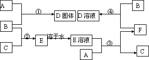 室温下,单质A、B、C分别为固体、黄绿色气体、无色气体,在合适反应条件下,它们可以按下面框图进行反应.又知E溶液是无色的,请回答: