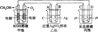 当乙池中B(Ag)极质量增加5.4 g,甲池中理论上消耗O2的体积为________L(标准状况),此时丙池中某电极析出1.6 g某金属,则丙池中的某盐溶液可能是________