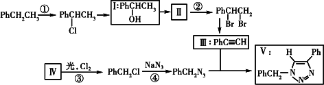 叠氮化合物应用广泛,如NaN3可用于汽车安全气囊,PhCH2N3可用于合成化合物V(见下图,仅列出部分反应条件,Ph-代表苯基).