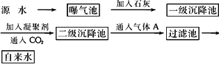 源水曝气池加入石灰一级沉降池加入凝聚剂通入CO2二级沉降池通入气体A过滤池自来水