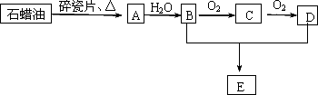 A是一种重要的化工原料,其产量可以用来衡量一个国家的石油化工水平,D是一种酸性物质,E是具有果香气味的烃的衍生物.A、B、C、D在一定条件下存在如下转化关系(石蜡油含17个碳原子以上的液态烷烃,部分反应条件、产物被省略).
