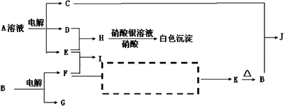 已知A、B均是由两种元素组成的化合物,A中某种元素的质量分数为75%,B是一种淡黄色固体,C、J是同周期元素的气态氢化物,其中C是含氢量最高的烃,X为无色液体.反应生成的水均已略去.它们有如下图所示的关系.