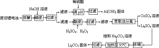 2006年世界锂离子电池总产量超过25亿只,锂电池消耗量巨大,对不可再生的金属资源的消耗是相当大的.因此锂离子电池回收具有重要意义,其中需要重点回收的是正极材料,其主要成分为钴酸锂(LiCoO2).导电乙炔黑(一种炭黑).铝箔以及有机粘接剂.某回收工艺流程如下: