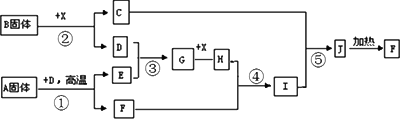 根据下图所示的关系填空,已知A为FeS2固体,C的焰色反应火焰呈黄色,其中①、③是硫酸工业生产中的重要反应,D、E常温下为气体,X常温下为无色液体,F是红棕色固体.