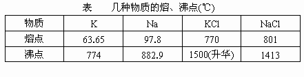 金属钾与金属钠的金属性相近,且钾比钠略强.当利用金属钾与钠盐共熔制金属钠时,发现钾与钠的共熔体难以分离.如调整温度到一定程度,则可用金属钠与氯化钾反应制取金属钾.