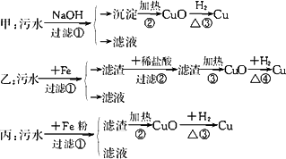 某化工厂排放的污水中含有Al3+、Fe3+、Hg2+、Cu2+四种离子.甲、乙、丙三位同学设计的从该污水中回收金属铜的方案分别如下: