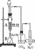 某化学课外小组用下图装置制取溴苯.先向分液漏斗中加入苯和液溴,再将混合液慢慢滴入反应器A(A下端活塞关闭)中.