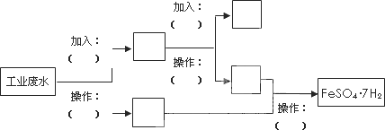某工厂的工业废水中含有大量的FeSO4、较多的Cu2+和少量的Na+.为了减少污染并变废为宝,工厂计划从该废水中回收硫酸亚铁和金属铜.请根据流程图,在方框和括号内填写物质名称(或主要成分的化学式)或操作方法,完成回收硫酸亚铁和铜的简单实验方案.
