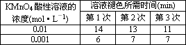 (2)在其它条件相同的情况下,某同学改变KMnO4酸性溶液的浓度,测得以下实验数据:(从混合振荡均匀开始计时)