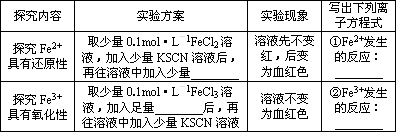 某化学兴趣小组利用实验室提供的下列试剂:铁粉、0.1 mol·L-1 FeCl3溶液、0.1 mol·L-1 FeCl2溶液、KSCN溶液、新制氯水,探究Fe2+、Fe3+的氧化性、还原性,并对实验结果加于应用.