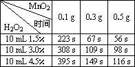 某实验小组为确定过氧化氢分解的最佳催化条件,用如图实验装置进行实验,反应物用量和反应停止的时间数据如下: