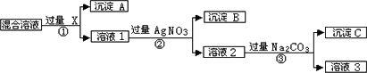 现有含NaCl、Na2SO4和NaNO3的混合物,选择适当的试剂将其转化为相应的沉淀或固体,从而实现Cl-、SO42-、和NO3-的相互分离.相应的实验过程可用下图表示: