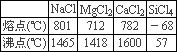 对此有下列说法:①CaCl2属于离子晶体;②SiCl4是分子晶体;③1500℃时,NaCl可形成气态分子;④MgCl2水溶液不能导电.与表中数据一致的说法有 | |