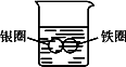 如下图所示,烧杯中盛的是水,铁圈和银圈直接相连,在接头处用一根绝缘细丝吊住,并使之平衡.小心地从烧杯中央滴入CuSO4溶液,反应一段时间后,观察到的现象是
