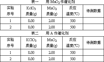 某中学化学小组查阅资料发现金属氧化物A也能催化氯酸钾的分解,且A和二氧化锰的最佳催化温度均为500℃左右.于是对A和二氧化锰的催化性能进行了定量对照实验.实验时均以收满500 mL氧气为准(其他可能影响实验的因素均已忽略).