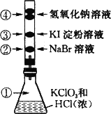 已知常温下氯酸钾与浓盐酸反应放出氯气,现按下图进行卤素的性质实验.玻璃管内装有分别滴有不同溶液的白色棉球,反应一段时间后,对图中指定部位颜色描述正确的是( ).