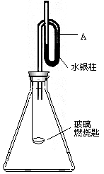 在常温下按图装配好装置,待内外空气压强不变时,水银柱液面在A处,取下橡皮塞,在玻璃燃烧匙中加入二硫化碳,用酒精灯点燃并迅速移入锥形瓶中,并塞紧橡皮塞.二硫化碳安静地燃烧(设氧气充足),水银柱推向左管.简要回答下列问题: